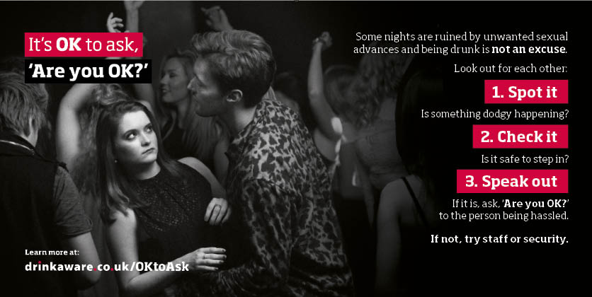 ‘It’s OK to Ask’ is part of Drinkaware’s ongoing ‘If You Wouldn’t Sober, You Shouldn’t Drunk’ campaign and was developed with input from a number of experts including Hollaback’s Good Night Out campaign and the Suzy Lamplugh Trust.