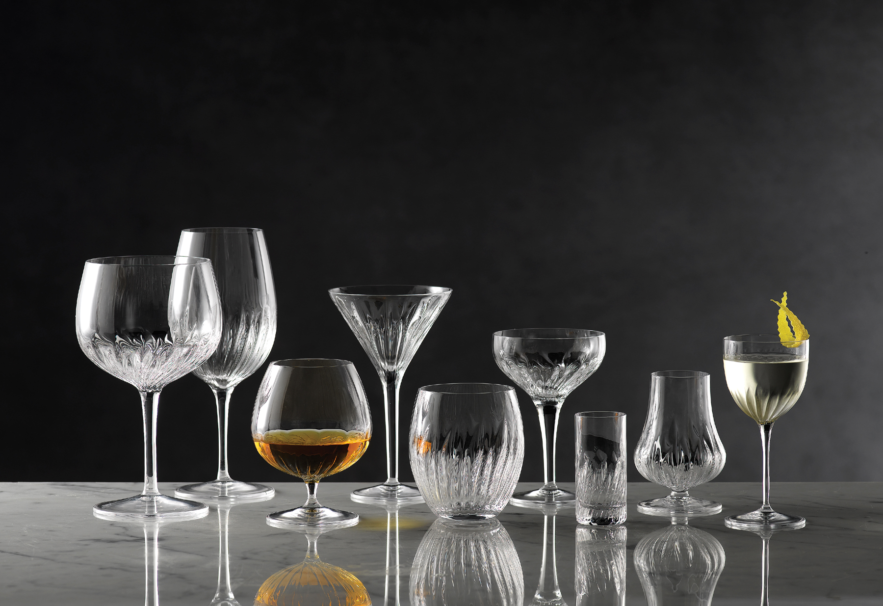 The collection comprises several different styles and includes Textures, Charme and Elixir designs in decanters, dash bottles, hi-balls and double old-fashioned glasses alongside spritz, coupe, martini glasses and a gin goblet.