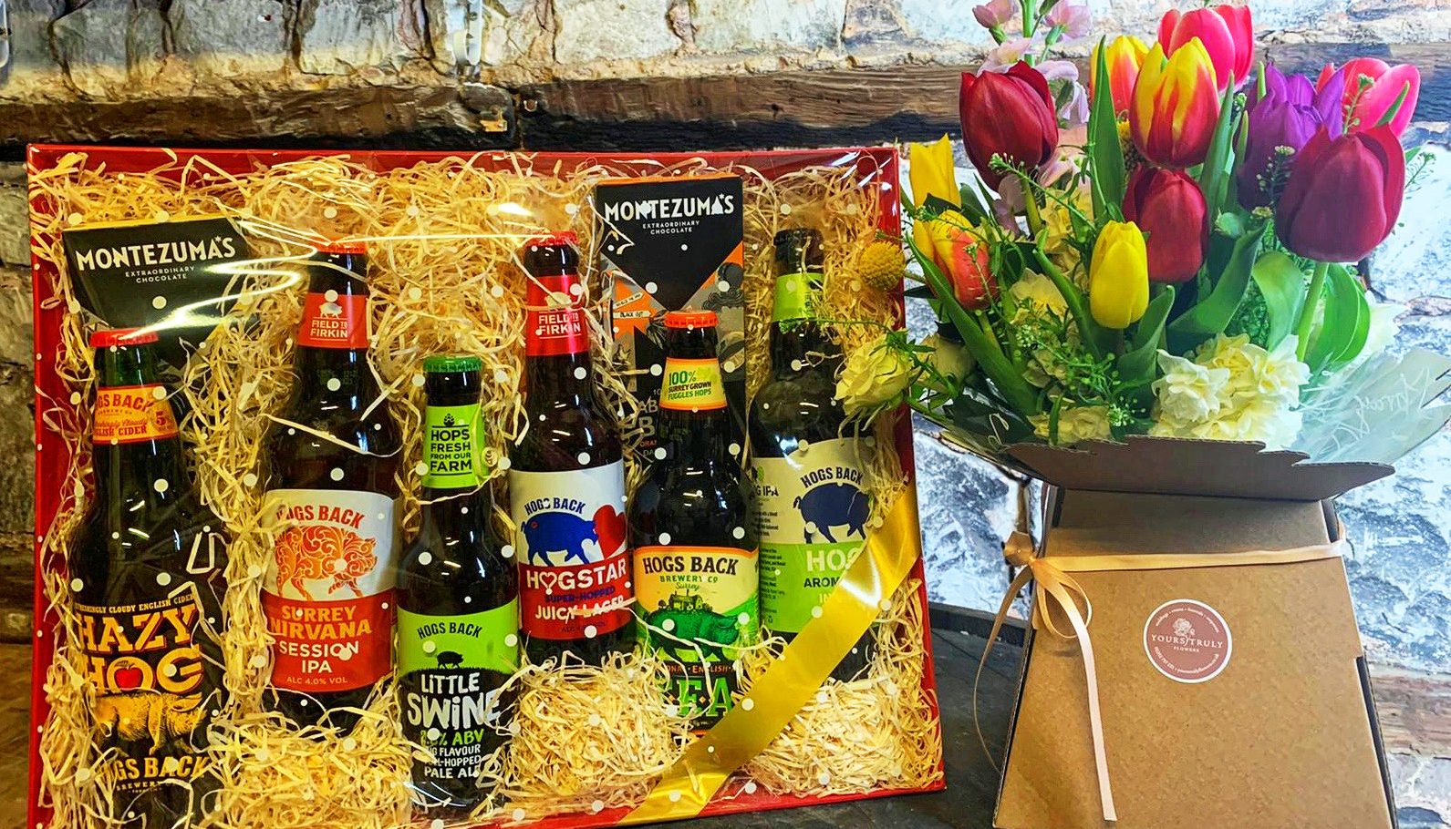 - Fresh Flowers & Large Beer Hamper (£45): one bottle each of Hazy Hog cider, Hogstar Juicy Lager, Little Swine, Surrey Nirvana, TEA and Hog IPA, and two bars of Montezumas chocolate