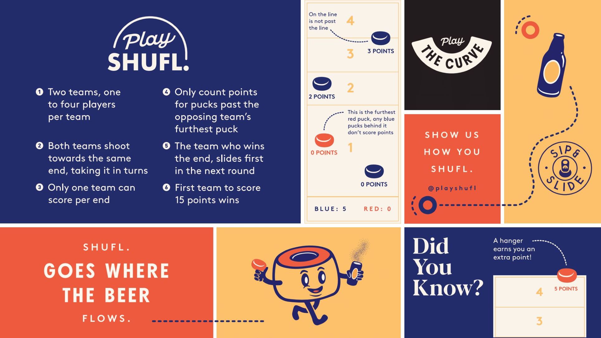 While the SHUFL logo remains the same, there’s a whole raft of fresh assets including graphics and vibrant colour palettes.  A central element of this is a new brand mascot, Pucky, an embodiment of a shuffleboard puck holding a beer and celebrating the brand’s signature ‘sip and slide’.  This new suite of brand assets will enable SHUFL’s partners to maximise in-venue promotion of their shuffleboard offer and, in turn, drive increased customer engagement.